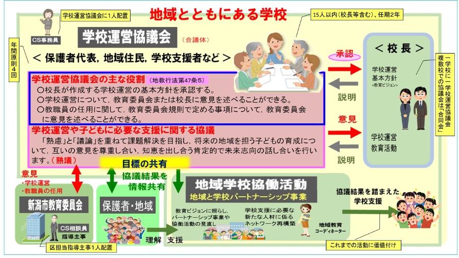 保護者、地域、学校が一体となって子どもの成長を支える体制を築き、「これからの社会をたくましく生き抜く力の育成」を目指した「地域とともにある学校」づくりを進める制度です。