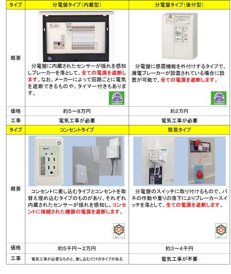 感震ブレーカー種類別一覧表