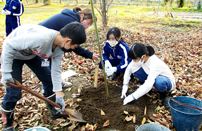 5、6年生の児童が、地域の皆さんと協力して、11月に前庭とグラウンドに柚子や四季咲桜など12本の木を植えました。未来につながる活動となるように、植える木は実をつけたり、学習に生かすことができるものを選びました。これから10年、20年先まで小合小学校を見守ってくれる木々をみんなで大切にしていきます。