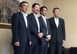 進出報告会(左から新潟県佐久間副知事、野田代表取締役、嶋田新潟支店長、新潟市高橋副市長)