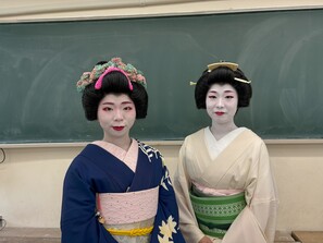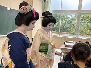 古町芸妓の和香さんとみすずさんを講師に迎え、古町芸妓の歴史や文化、芸の世界に関するお話を伺いました。生徒たちと一緒に「古町芸妓の魅力を発信するために、自分たちの探究とどう結びつけられるか」について考える授業を行いました。一緒に考え、時にはアドバイスをもらいながら、生徒たちは様々な視点からより具体的にアイディアを出し合いました。