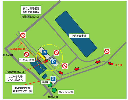 - 駐車場は中央卸売市場及びJA新潟市中部青果物センター様の指定エリアのみとなります。指定エリア外への駐車はご遠慮ください。