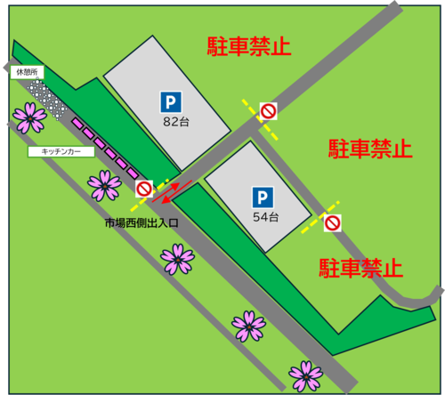 - 指定エリア以外の駐車場は利用できません。市場駐車場が満車の場合は、JA新潟市中部青果物センター様の駐車場をご利用ください。