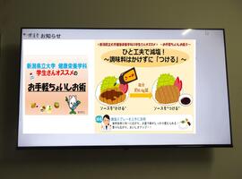 健康チェックイベントでは、市と健康づくりに関する包括連携協定を締結する住友生命保険相互会社新潟支社に協力いただいているほか、電子掲示板で掲載する媒体は、管理栄養士を目指す新潟県立大学の学生が実習の一環で作成したものを活用しています。