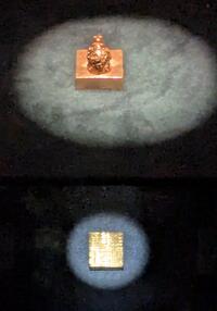 もちろん書籍で紹介されているとおり方形で一辺2.3センチ程度、鈕までの高さ2.2センチ程度、なのは知っていましたが、実際に見るとイメージより小さく、そして練りに練られた技術の結晶であることが伝わってきます。私が見たときは実物展示でしたが、レプリカ展示の場合もあります。照明の影響もありますが、ほぼ純金製なのでピッカピカです。触れることはできませんが質量感も伝わってきます。文化財の持つ「リアル」を真に体感できました。