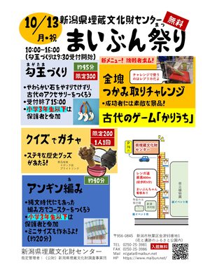 弥生の丘展示館まいぶん祭りチラシはこちら(PDF:692KB) 新潟県埋蔵文化財センターまいぶん祭りチラシはこちら(PDF:699KB)