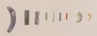 発掘調査によって、奈良・平安時代を中心とする多量の土器や漁具等の遺物が、非常によい状態で出土しました。中でも注目されるのは、文字が記された木の札(木簡-もっかん-)や、奈良時代に流通した古い銭貨の一つである和同開珎(わどうかいちん)が出土したことです。また、魚とりに使う網のおもりと浮きのセットなど、全国的にも貴重な資料といえます。的場遺跡は、奈良・平安時代の水産物の捕獲や管理に関係する基地のような性格を持っていたようです。