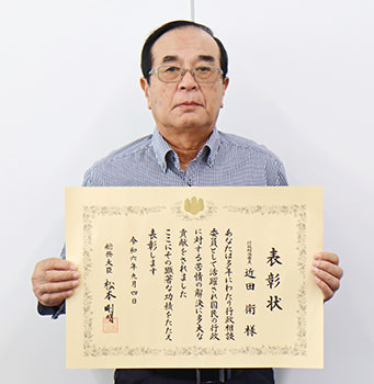 行政相談委員の近田衛さんが総務大臣表彰を受賞されました。行政相談委員は、総務大臣の委嘱を受け、地域住民から国の行政に対するさまざまな苦情・要望などの「困りごと」相談を受け付け、相談者への助言を行ったり、関係行政機関に対して改善を働きかけたりしています。近田さんは平成22年から14年余りの精力的な活動が認められ、今回の受賞となりました。