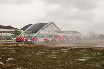 一斉放水開始と同時に消防車両がサイレンを鳴らします。火災ではありませんのでご安心ください。