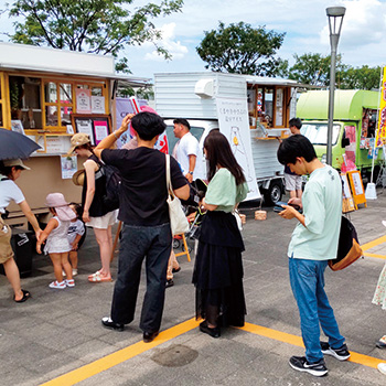7月27日、よこごし公園のキッチンカースペースに地元事業者など10店舗が出店しました。当日は天候にも恵まれ、親子連れを中心に多くの方が来場し、賑わいました。