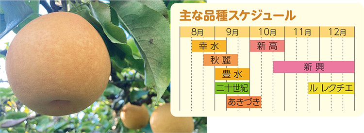 江南区の梨栽培は、12月まで切れ間なく収穫できるよう、様々な品種を栽培しているところが特徴です。自然の恵みを受けて育った梨は、果汁たっぷり。ぜひ、色々な種類を味わってみてください!