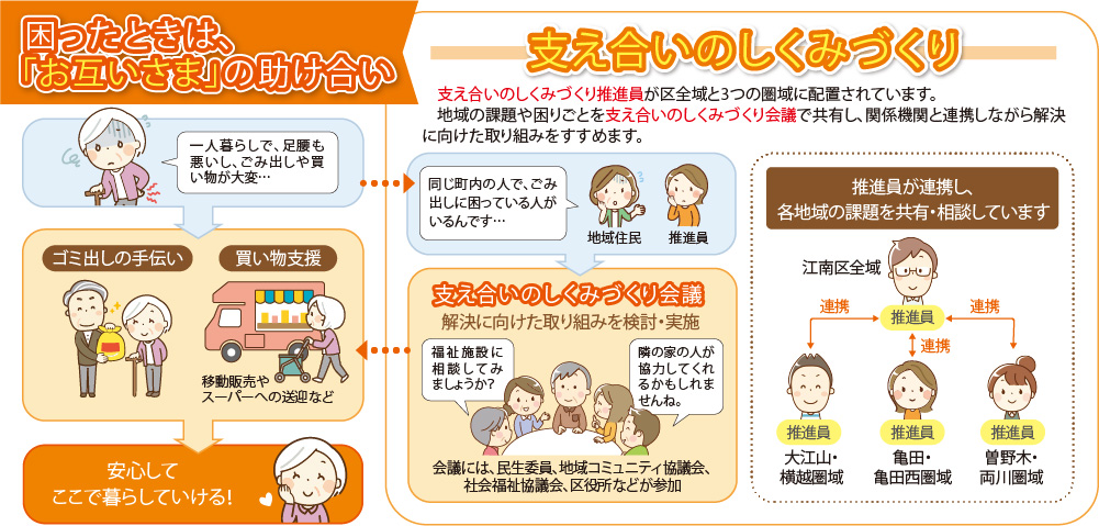 地域の課題や困りごとの解決に向け、支え合いのしくみづくり推進員が関係機関と連携しながら活動を行っています。
