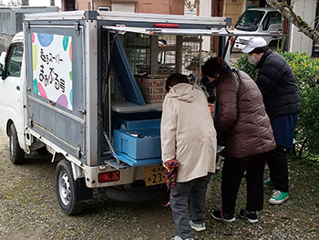 「近くに買い物できる場所が少ない」と地域の高齢者から相談を受け、上大渕地域で移動販売車「まぁぶる」による買い物支援を始めました。有名店監修の弁当や惣菜、自社製品のチーズケーキが大人気!