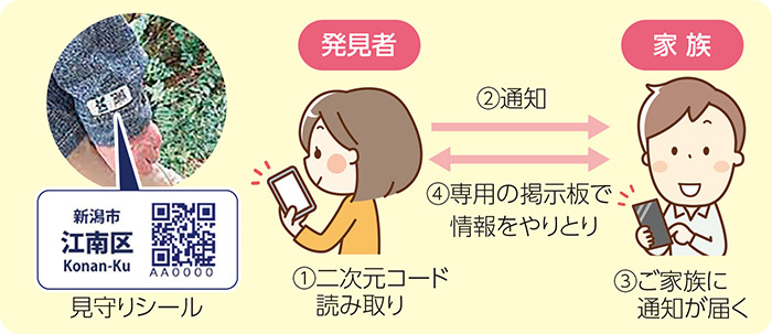 認知症のある方の服や持ち物に貼り付けられた「見守りシール」を発見者が読み取ることで、ご家族とインターネット上の伝言板で連絡を取ることができます。