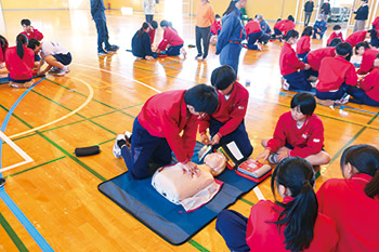 生徒たちは消防署および消防団から指導を受け、心肺蘇生法、AEDの使い方、応急手当など、災害時の基礎的な技術を学びました。