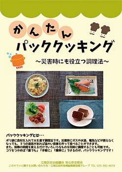 パッククッキングとは、ポリ袋に食材を入れて火を通す調理法です。災害時にガス、水道、電気などが使えなくなっても、3つの道具(鍋、カセットコンロ、ポリ袋)があれば温かい食事を作って食べることができます。便利なレシピをまとめた冊子を配布していますので、ぜひご活用ください。