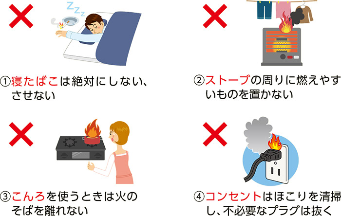 全国的に多数の死者が出ている出火原因は、たばこ、ストーブ、こんろ、電気機器など、身近なものが多くを占めます。ポイントを守って住宅火災を防ぎましょう。