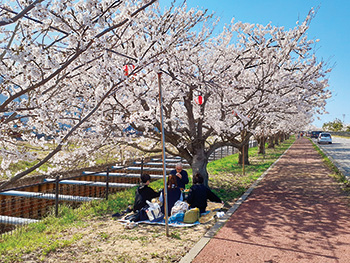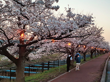 横越排水路(すごぼり)沿いに続く約3.3kmの桜並木にぼんぼりが飾られます。