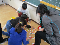 支度が終わった児童から、「ゆったりタイム」に入った。保育園でやった経験のあるカルタやお絵描き・けん玉・こま等を自由に使えるような環境を整えておき、好きなもので遊ぶことができるようにした。知っている遊びが教室にあることで、安心して過ごすことができる。出身園の異なる児童同士でも、遊びを通して自然にかかわりが生まれ、生き生きとした表情で活動する様子が見られた。
