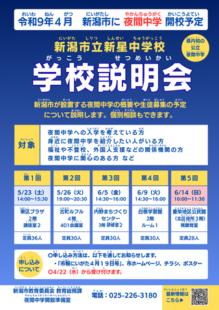 新潟市が設置する夜間中学のことや生徒募集の予定について説明します。個別相談もできます。