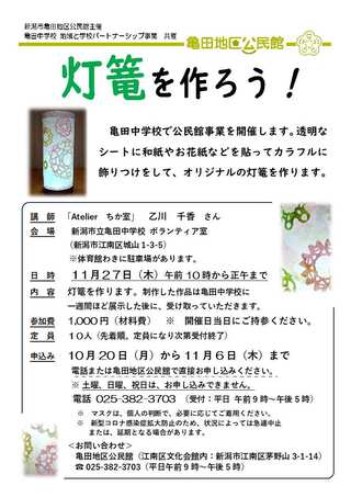 亀田中学校で公民館事業を開催します。透明なシートに和紙やお花紙などを貼ってカラフルに飾りつけをして、オリジナルの灯篭を作ります。
