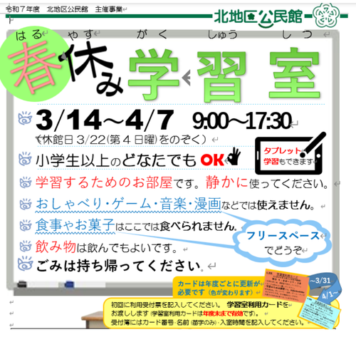 北地区公民館 春休み学習室