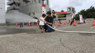 本物のホースを使用して、消防士さながらの放水体験ができます。職員がサポートしますので、お子さんもぜひご参加ください!