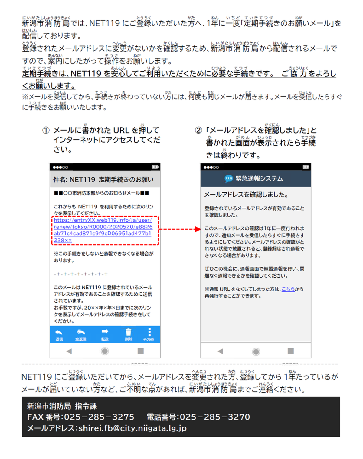 ※迷惑メールフィルタリング等をご利用の場合には、NET119緊急通報システムからのメールを受信できるように、「web119.info」をドメイン受信設定していただくようお願いします。