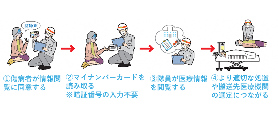 マイナ救急では、救急隊員がご本人のマイナ保険証を活用し、傷病者が過去に受診した病院や処方されたお薬などの医療情報を閲覧します。ご本人や付き添われるご家族の方の負担を軽くするとともに、傷病者の方がより適切な処置を受けるのに活用します。