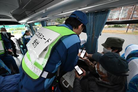 避難経由所でバスに乗車したまま受付をする様子
