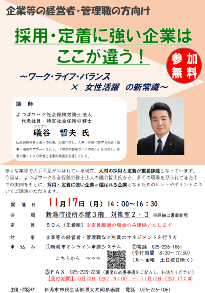 今回は、よつばワーク社会保険労務士法人の礒谷哲夫氏から、多くの現場を見られてきた中での実例をもとに、採用・定着に強い企業=選ばれる企業になるヒントやポイントについてご講演いただきます。