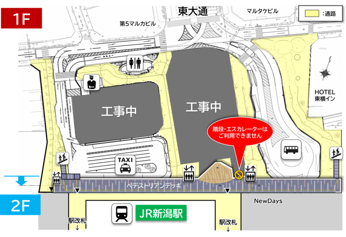 ※ペデストリアンデッキの中央階段とエスカレーターは、しばらくの間使用できません。
