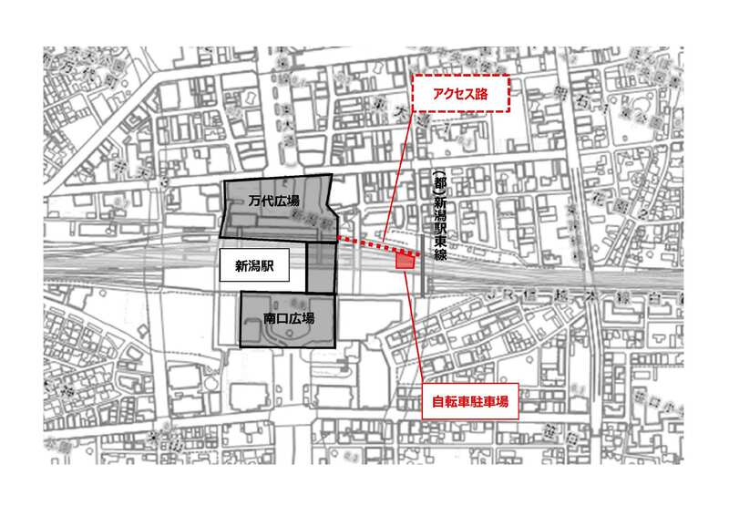 自転車駐車場はアクセス路を通り、万代広場及び(都)新潟駅東線よりアクセスできます。