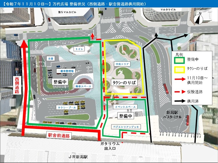 万代広場の整備におきまして、ご利用・ご通行の皆様にご協力いただきありがとうございます。万代広場の整備では完了した部分から供用を開始しています。
