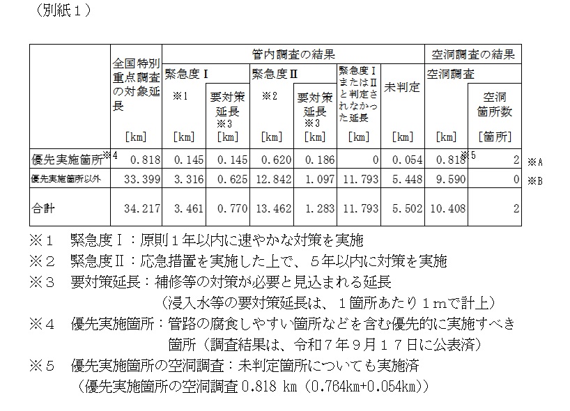 なお、緊急度1・2について、管の周辺部に空洞が生じていないか路面下空洞調査を実施しており、7月までに完了予定です。引き続き、空洞の可能性がある箇所については、開削調査を行い空洞の有無を確認し、対策を行います。※B