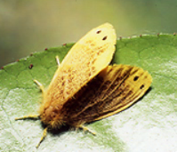 - 大きさ2cm位の黄色っぽい蛾。翅の先に2個の小さい黒い点があります。