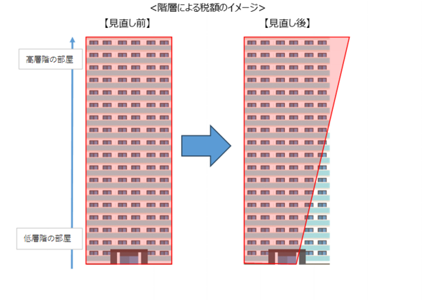 平成29年1月2日以降に新たに建てられた高さが60mを超える居住用超高層建築物の場合は、地方税法第352条に基づき、階層に応じた補正率を算出し、税額の補正を行います。高層階の税額は増加し、低層階の税額は減少することになりますが、1棟全体の税額は変わりません。