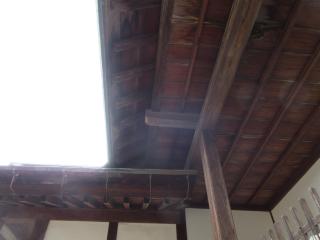 軒先は深く庇柱から4尺6寸(138センチメートル)出ています。雪の重みに耐えるために垂木を鼻桁で支え、さらに鼻桁を桟梁で支えています。この桟梁は内側の柱までつながっており、庇柱を支点にして軒の重みをささえています。この鼻桁と桟梁の組み方を船がい造といいます。組頭より上層の人の住宅にしか許されませんでした。