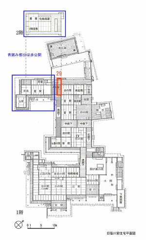 大正元年(1912)に2階が増築されました。直階段で幅は4尺(1.2メートル)、踊り場もあり、ゆったりとしています。上りきった正面に窓があり、明るい階段となっています。2階建ても、余裕のある階段も、当時の日本では珍しいものでした。 ※非公開
