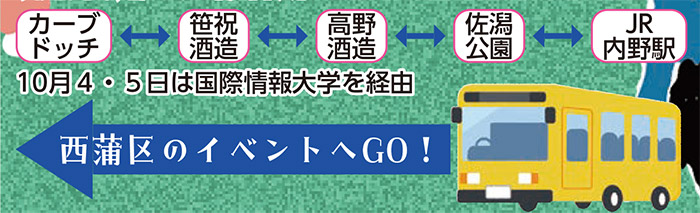 発酵街道シャトルバスはカーブドッチまたは笹祝酒造でにしかん観光周遊ぐる~んバスに乗り換え乗車できます。西蒲区のイベントも、ぜひお楽しみください。