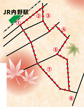 (1)内野駅 から (2)復興観音 から (3)義勇碑・清徳寺 から (4)いちょう公園 から (5)金比羅神社 から(6)新川西川立体交差 から (7)吉田稲荷神社 から(1)内野駅(コース全長約2.7㎞)