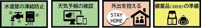 大雪が予想されるときは、知っておくとよいことやすべきことがいくつもあります。下記に示す代表的な情報を参考に、慌てずに大雪に備えましょう。