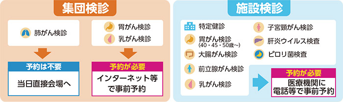 病院など医療機関で検診を受ける場合は、各委託医療機関に予約の上、受診してください。集団検診で行うがん検診は、検診日が決められています。検診日や予約先は、案内冊子『検診いっ得』をご確認ください。