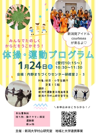 新潟大学の大学院生が研究をもとに開発した楽しく体を動かす「体操・運動プログラム」を開催します!なんとゲストに新潟発アイドルも♪親子での週末のお出かけ先にぜひご検討ください!