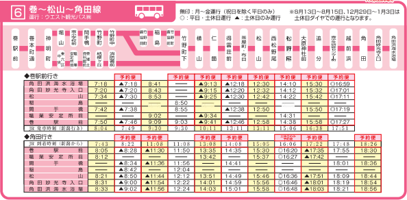 - 「巻駅前」乗車、「海水浴場」下車(約30分)、「灯台コース」登山口まで徒歩約5分
