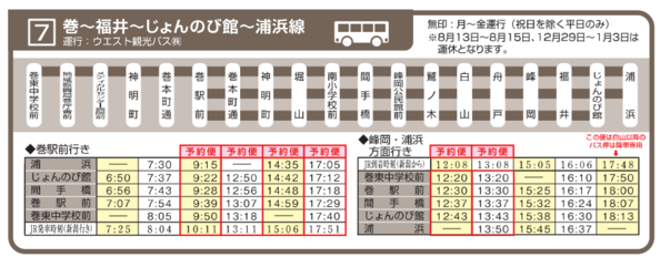 - 「巻駅前」乗車、「浦浜」下車(約30分)、「浦浜コース」登山口まで徒歩約4分