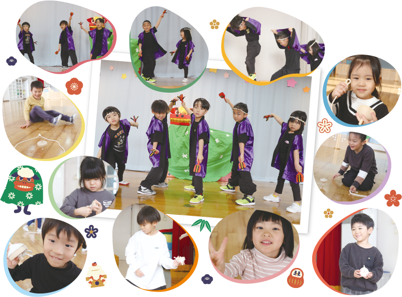 巻つくし保育園の園児が、獅子舞ダンスやコマ遊びをしました!