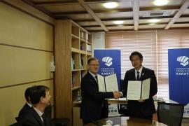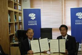 このたび、「フランス空手連盟」と東京2020オリンピック競技大会に向けた合宿の実施について合意し、協定の締結を行いました。なお、締結式は、中原市長の訪仏に合わせて、パリのフランス空手連盟にて行いました。