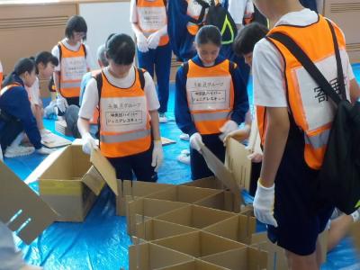 ハイパージュニアレスキュー体験プログラム。防災士の方からの指導のもと、避難所で利用される簡易施設を設営。
