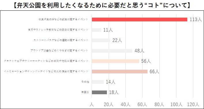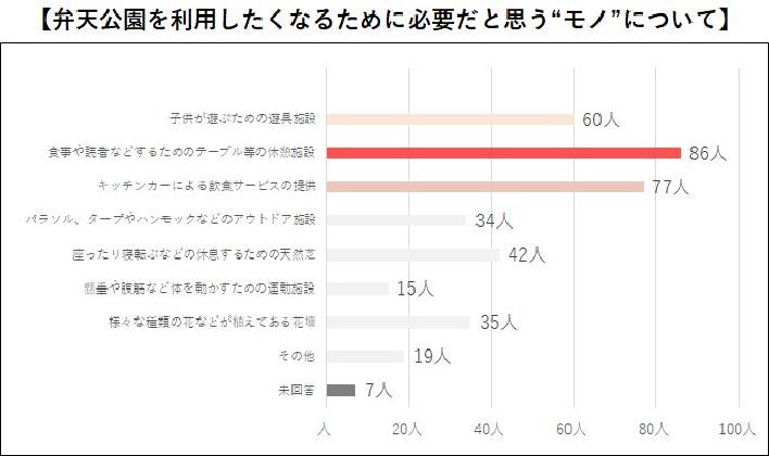 また、弁天公園を利用したくなるために必要な"モノ"と"コト"の結果から、「食事もできて、くつろげる」憩いの空間を望んでいる傾向が見られました。